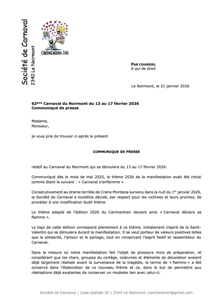 Par respect pour les gens touchés de près ou de loin par la tragédie survenue dans la nuit du 31 décembre 2025 au 1er janvier 2026 à Crans-Montana, le comité de Carnaval a décidé de modifier le thème de cette prochaine édition en